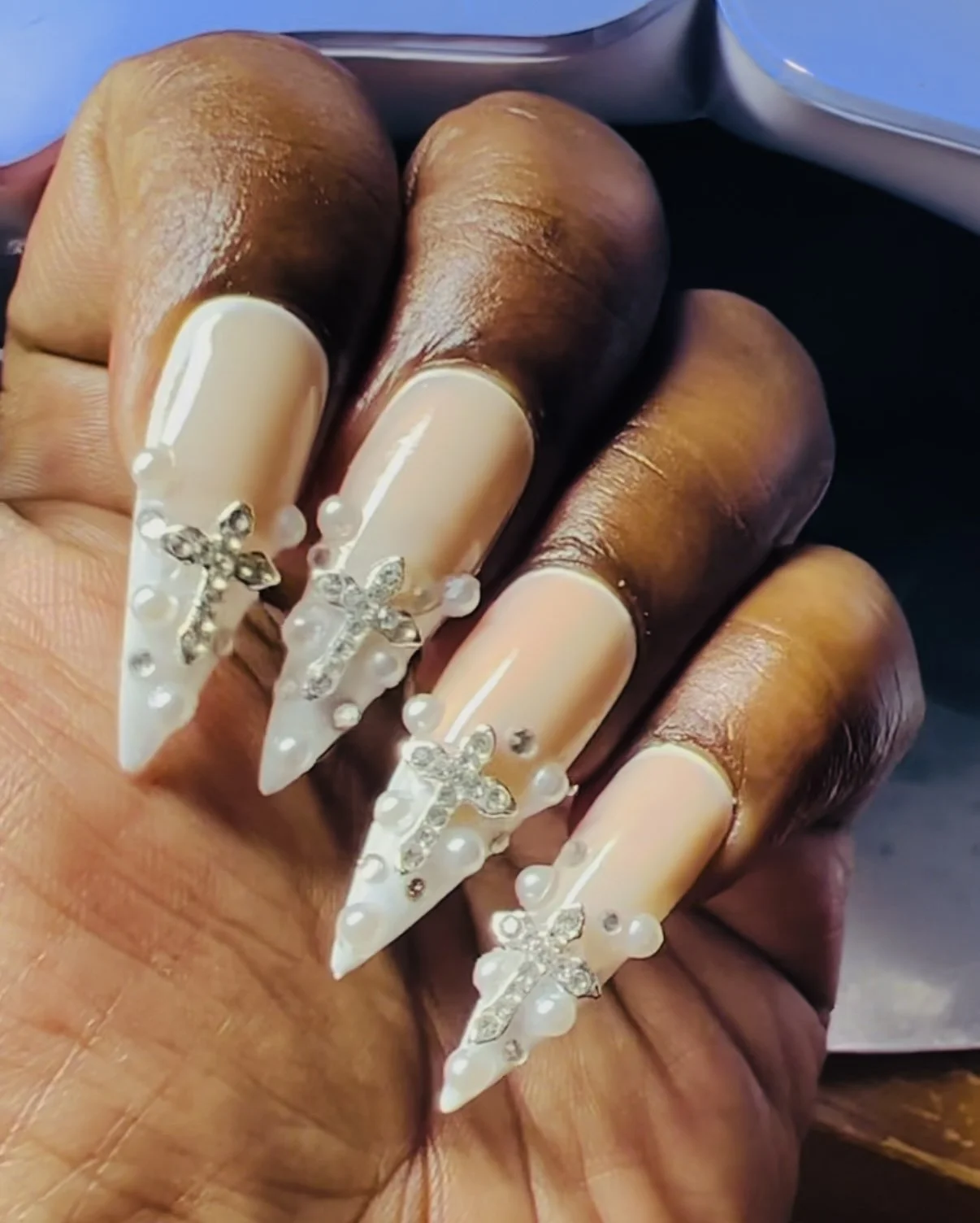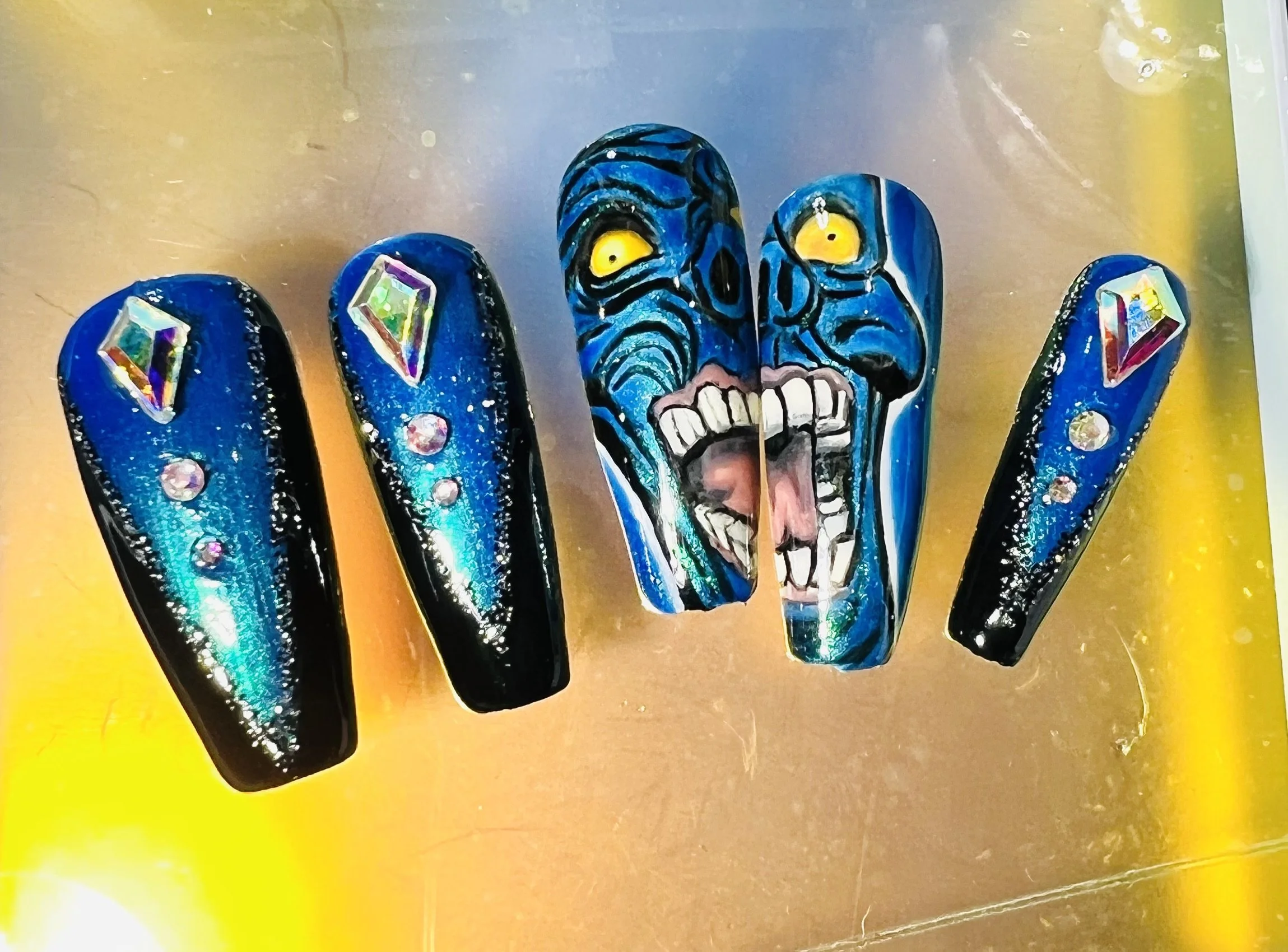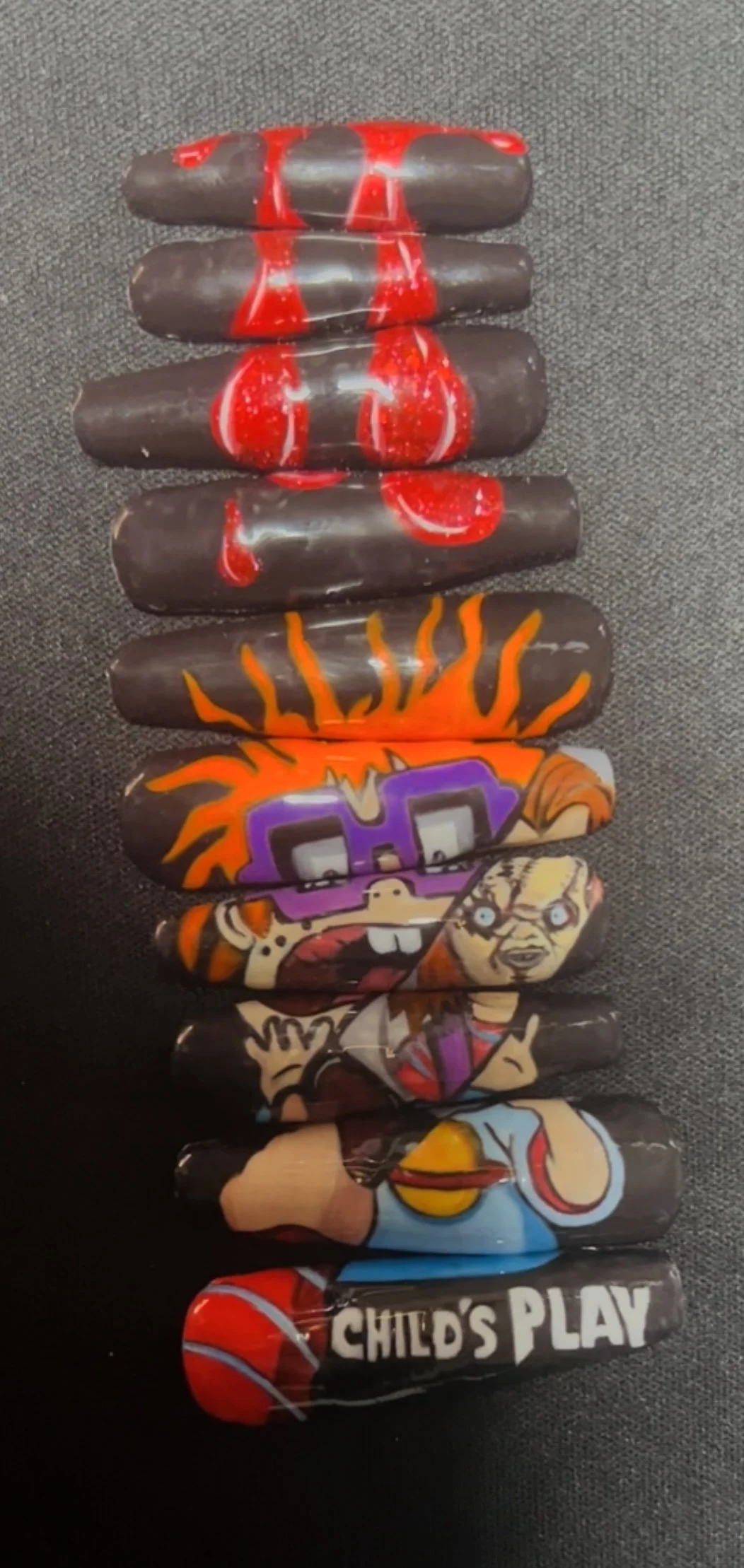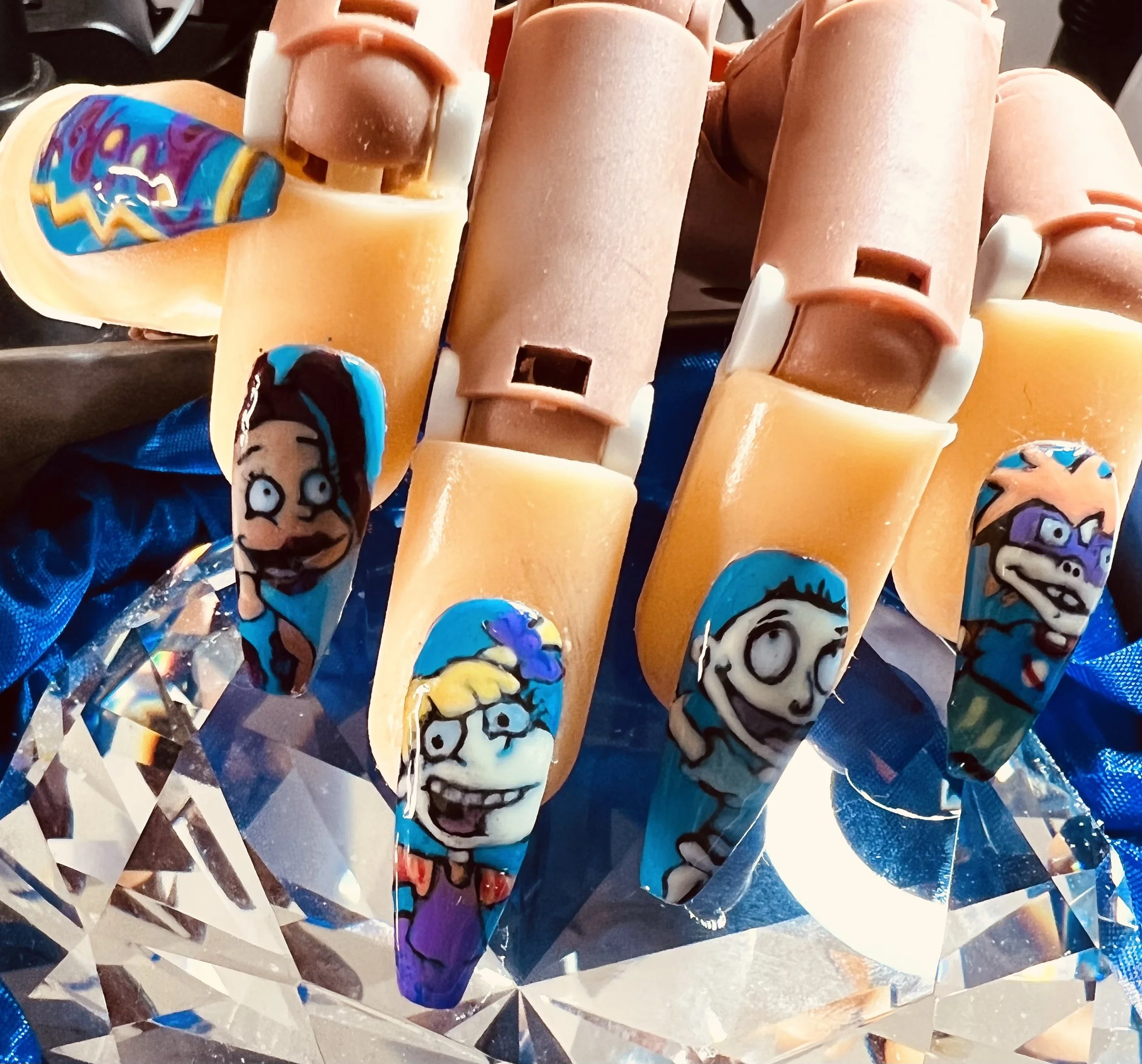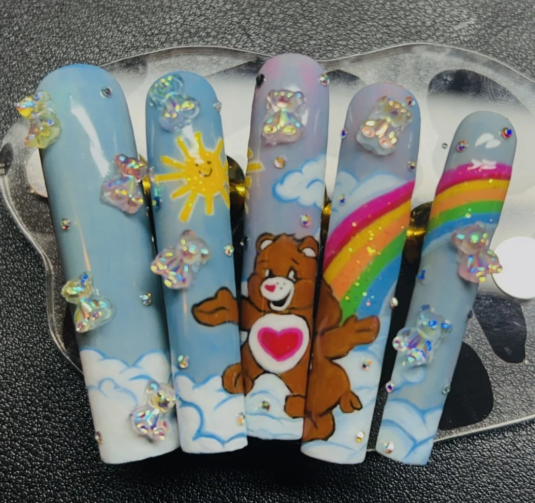 Hand-painted ‘CareBear’ Nails with Embellishments and colored glittery bottoms (underneath nails)